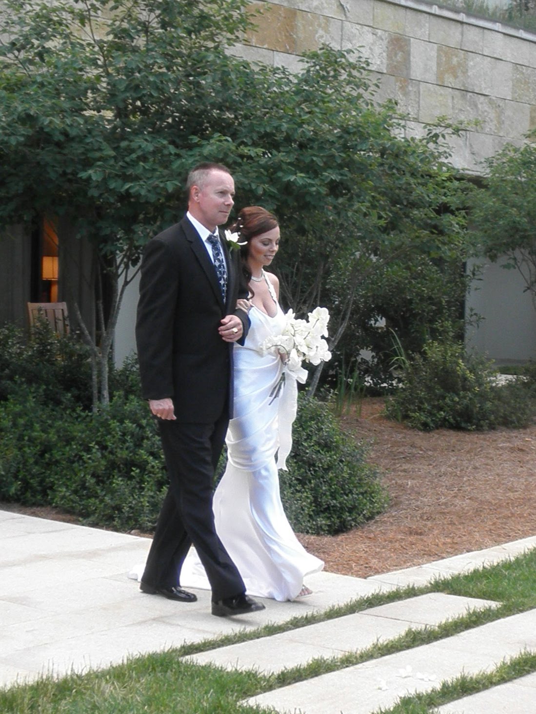 Here comes the bride! Her gown and bouquet of white orchids were exquisite! She was beaming!