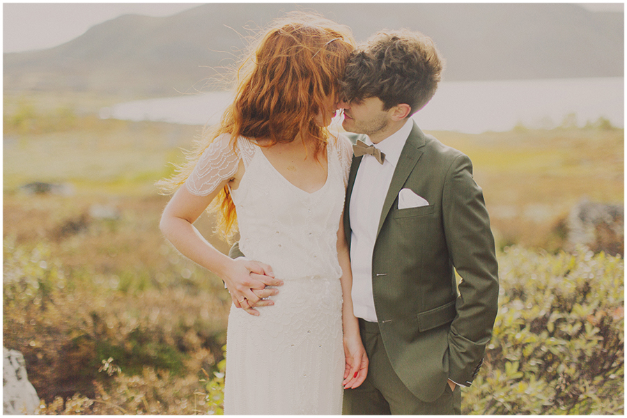 Vi synes den norske naturen gir en perfekt ramme, til et perfekt par. Norske vakre bunader, blir bare enda vakrere, sammen med den kjekke brudgommen og hans menn, i flotte staselige kilt. Skotsk og norsk nasjonalromantikk på sitt beste. Samtidig er det en avslappet og elegant atmosfære i alt det rustikke, og bruden får skinne i all sin eleganse, i den åh så lekre Jenny Packham kjolen, med nydelig hårpryd fra samme designer, i det vakre røde håret. Hår som vi andre bare kan drømme om. Brudgommen er også ultrastilig i sin dress fra J. Lindeberg.