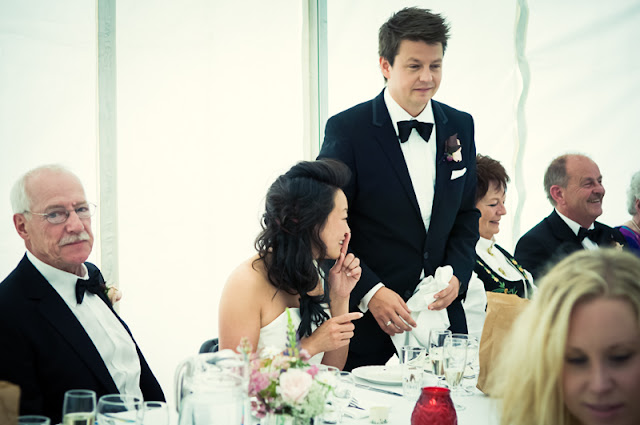 Selve vielsen var i vakre Skjeberg kirke, og bryllupsfesten ble holdt i hagen til brudeparets sommerhus i Skjebergskilen. Vi synes det skaper en perfekt ramme, og personlig atmosfære, hvor man tydelig ser at dette er en bryllupsfeiring sammen med gode venner & familie. Bruden er nydelig i sin brudekjole, og med en brudebukett vi elsker, og som er litt 'vill & vakker'. Angående brudebuketten sier bruden: "Floristen heter Wibecke Kathrine Fladeby Johansen. Hon var faktiskt den enda av många som var med på hela grejen om att inte göra en fancy bröllops bukett utan, och var till och med ute och plockade ängsblommor till buketten, samt de vi hade på borden för att göra det så naturligt som möjligt bland de andra "odlade"."