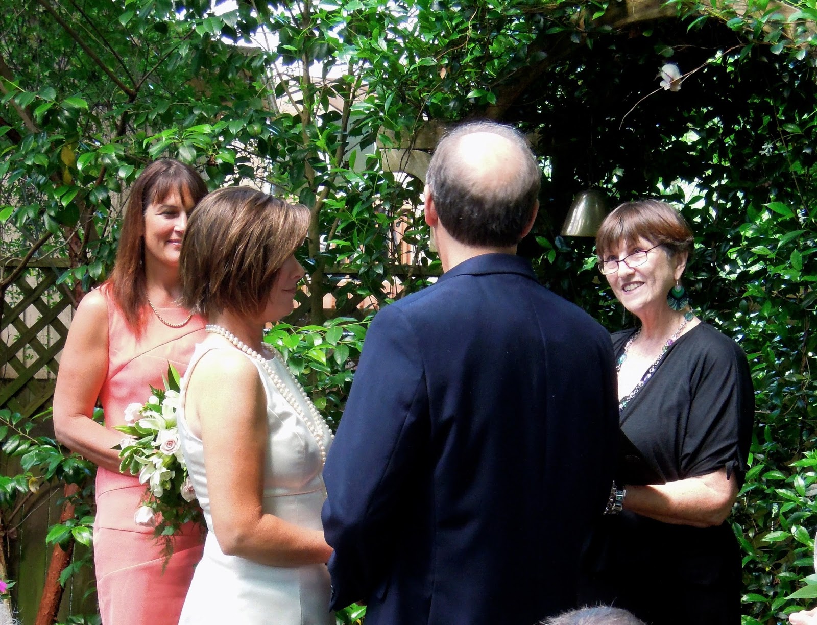 Kelly and Jim are so blessed to have found each other. And they know what a perfect match they are. They both had been married before and so really treasured the love and compatibility they found with each other and wanted to spend the rest of their lives loving each other. I had married their friends Marcia and Hugo in April of 2012 so they knew they wanted me to officiate for them. Originally their wedding was going to be May 18th but it got postponed to May 31, 2013. So on that beautiful day they arrived with their guests, including Marci and Hugo, to my garden for the ceremony.