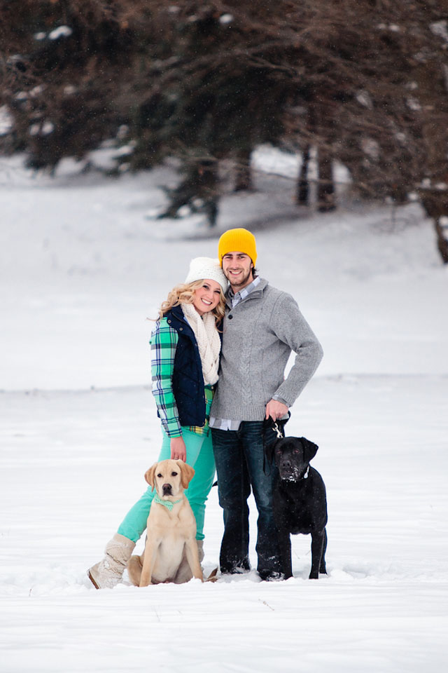 FOTOGRAFEN FORTELLER: Courtney and Mike are two fun-loving spirits. We couldn't think of a better way to represent her love of pretty things and his love of hockey than a perfect snowy engagement session on the ice. There just happens to be the perfect private pond just around the corner from their home and we couldn't have ordered a better day! They even brought out their two babies (Labrador Retrievers), one with a bow tie that matches their wedding color of Mint. Fluffy white snow, a frozen pond and two beautiful people inside and out! What more can a photographer ask for? We can't wait for their fall wedding to hang out with these two again!