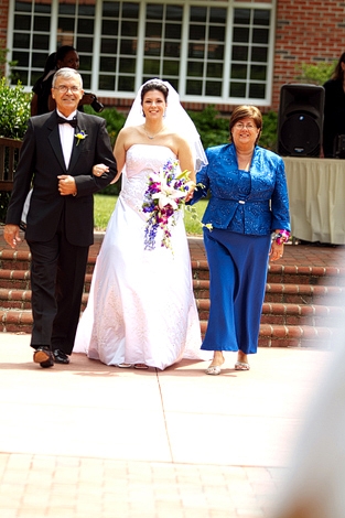 Krystal makes sure she does not fall behind her parents as they walk down the aisle. This photo is courtesy of Amy Turner. The wedding was at Brier Creek Country Club.If both parents are escorting you in, it is really important that it does not look like they are "dragging" you down the aisle, so step a little ahead of them rather than lagging a little behind.